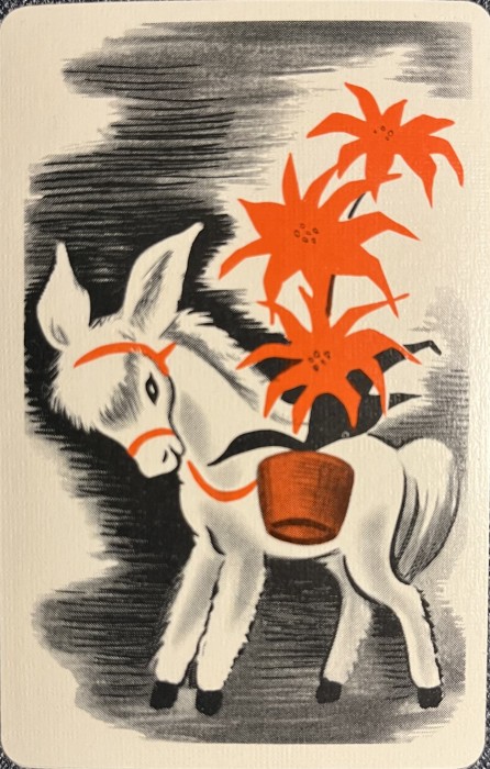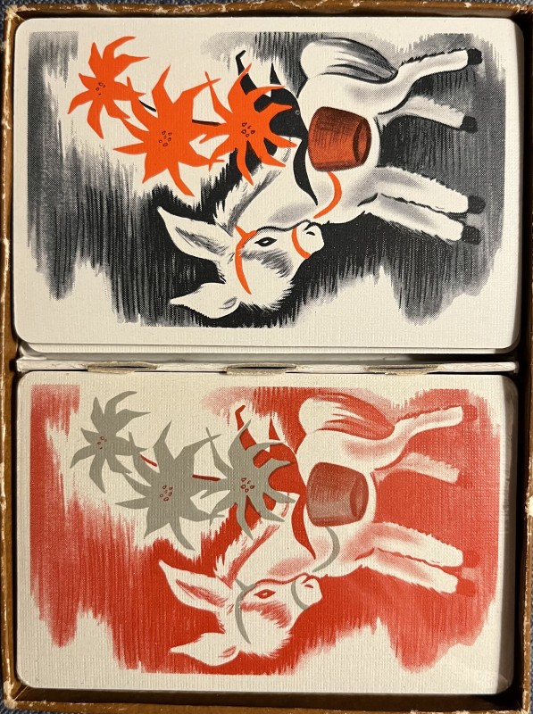 Double deck set featuring a donkey in red and a donkey in black. Red deck still sealed with tax sticker. Black deck open but like new.