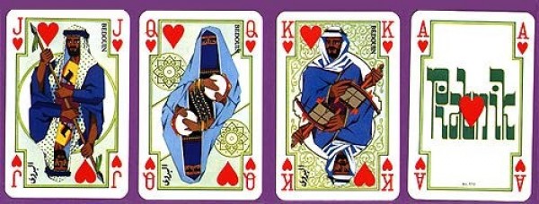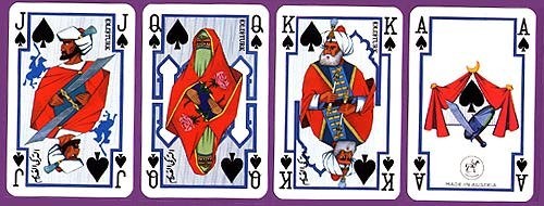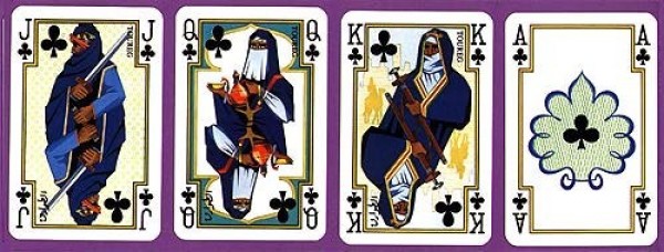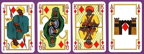The set consists of two full packs of 52 cards, each with 3 jokers. The court cards in both packs are decorated with figures representing four traditional Arab or North African tribes or groups: Bedouin (Hearts), Old Turk (Spades), Berber (Diamonds) and Toureg (Clubs).