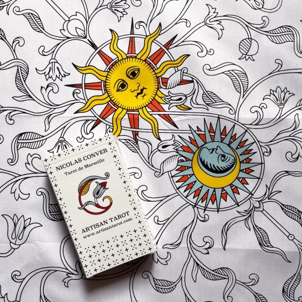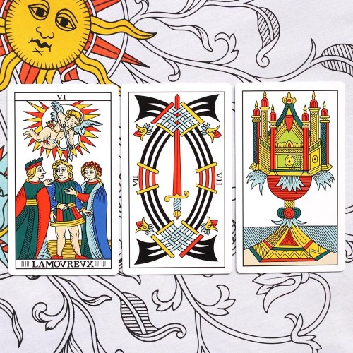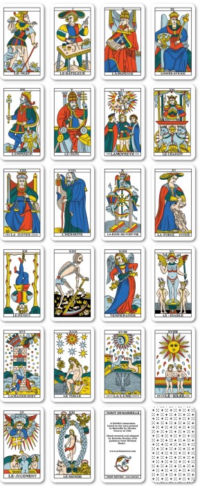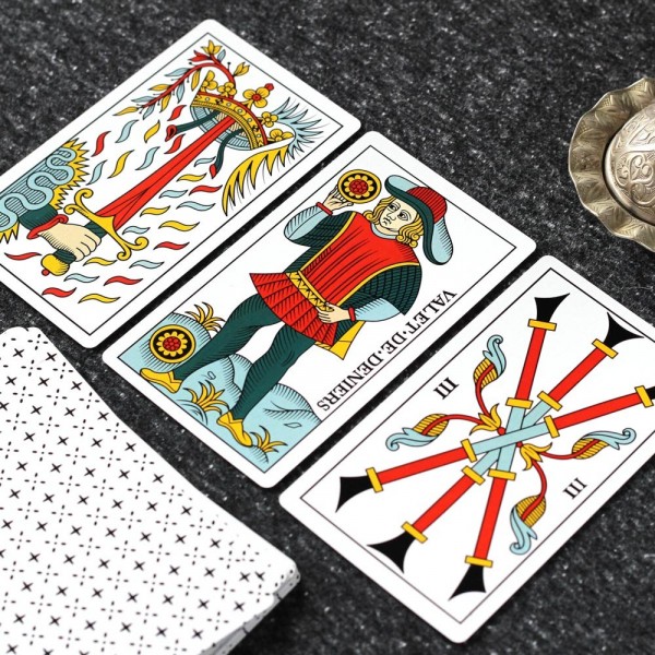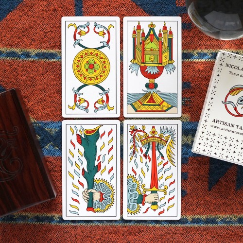 This deck was produced in Marseille in 1760 by Nicolas Conver. The cards are believed to hold ancient, esoteric wisdom and are used for divination. This is the complete 78 card tarot deck and includes an information card and promotional card. The deck is in French and the extra cards are in English.