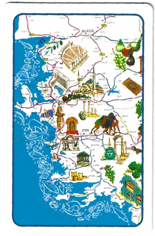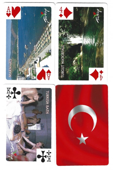 55 card deck, inc a card with the Turkish flag on and 2 jokers. Back design is a poor quality map. 52 colour photos of Turkey adorn the cards. Highly glossy and poor quality cards.