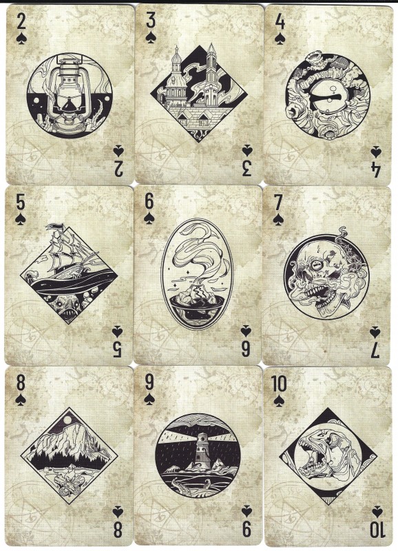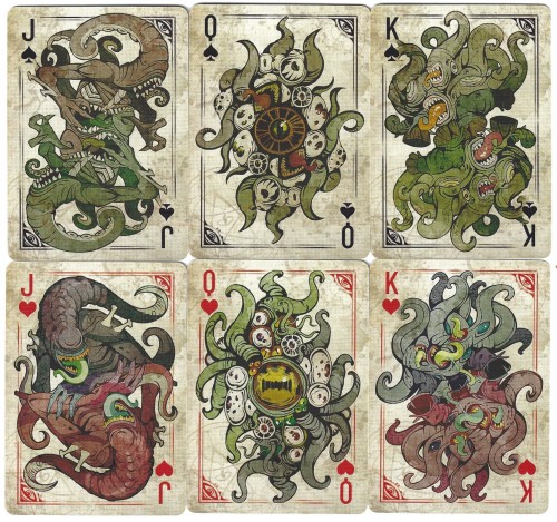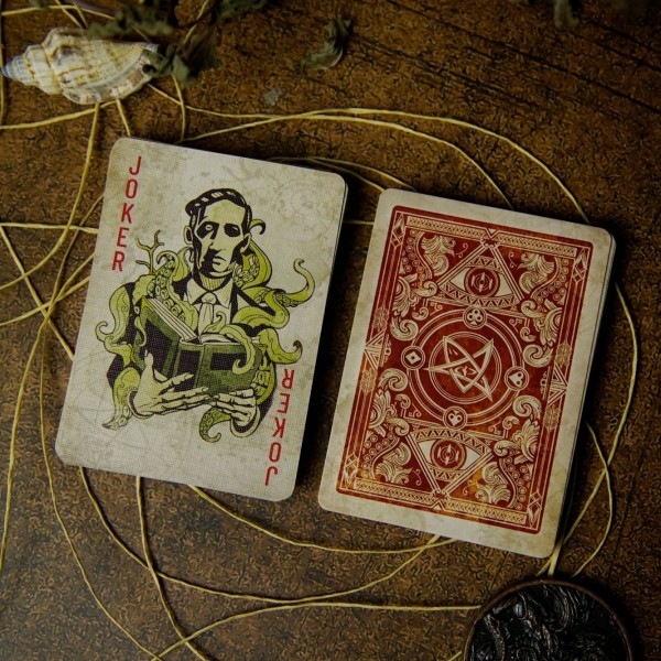 This 54-cards poker deck features exclusive Cthulhu-themed artworks based on Lovecraftian characters and scenes depicted. Cards come in high-quality printing with 300-GSM double copper paper embossed on both sides. The finishing is modified to protect the cards against scratches and stay ultra-smooth for playability while bouncing a subtle amount of light off. The Jack, Queen, and King cards (slightly different for each suit) are based on Shub-Niggurath, Yog-Sothoth, and Nyarlathotep. ♠ Ace of Spade: Hohenheim's Heart ♥ Ace of Heart: The Scary Truth ♣ Ace of Club: The Creature from the Woods ♦ Ace of Diamond: The Disciple of the Abyss