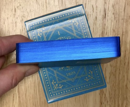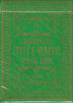 Gilded edition features all gold metallic ink on box, a gold tear band and custom numbered foil seal. Introducing a precisely digitally hand-recreated reproduction of the first published complete transformation playing card deck in the world! The blue "Joan of Arc" deck is the first in a series of six famous decks we plan to release. The very first transformation deck issued by Cotta is from 1805. This deck is probably the most famous of all six, and is incredibly scarce. Original illustrations were fiddling artworks done by hand, on copper plates that were manually engraved with stipple and etching, and the cards were printed on linen period stock that was 97 mm x 69 mm in size, with blank card backs and squared corners at that time. Only the court cards were hand-colored, while the number cards used red stencils. Cotta’s transformation cards were very successful and became a role model for later transformation decks from other publishers. And since the card backs were blank, individual cards were sometimes used by the nobility as visit cards and for leaving messages, so these playing cards often became multi-purpose items. The images on the court cards are characters inspired by Schiller's play "Die Jungfrau von Orleans" ("Joan of Arc"). The central figure of Joan of Arc is depicted as the Queen of Spades, the Maid of Orleans who inspired the French army to victory, but was later burned at the stake. The court cards were designated with the words "Valet", "Dame", and "Roi", which are the French terms corresponding to the Jack, Queen, and King. In the first deck, beside Joan of Arc depicted as the Queen of Spades, other individuals closely associated with Joan include Etienne de Vignolles or La Hire (Jack of Hearts), who helped Joan to victory in the battle of Patay in 1429; and Raymond (Jack of Diamonds), a peasant who was Joan's page. Key political leaders who figured prominently in the events surrounding Joan's life are also represented, including King Charles VII (King of Hearts), the French monarch who relied on Joan's help to reach the Rhiems, the traditional place of coronation; Charles' mother Isabeau (Queen of Hearts), who was in league with Charles' enemy; Charles' mistress Agnes Sorel (Queen of Diamonds); Charles' opponent Philippe the Good (King of Diamonds), an ally of England; and the king of Naples, René d'Anjou (King of Clubs), who lost the kingdom after defeat in battle. General Talbot (King of Spades) was the English commander of the outpost of Orleans at Saint Loup, who was wounded in battle, captured, and was part of a prisoner exchange. Both Joan's "sister" Louison (Queen of Clubs) and Montgomery (Jack of Clubs) are fictional creations of Schiller, while the fictional Lionel (Jack of Spades) is the character who holds up Joan's sword in a location revealed by the voices that she supposedly heard telling her to help.