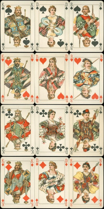 Originally released c. 1910 as "Hollandaises Illustrees No.515". This version has German indices and uses X in place of 10. No jokers were included with this deck.