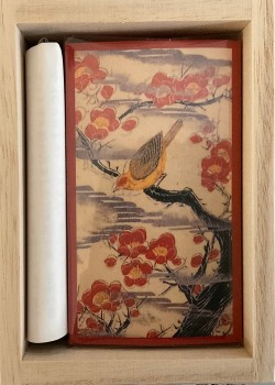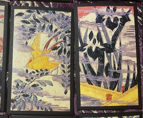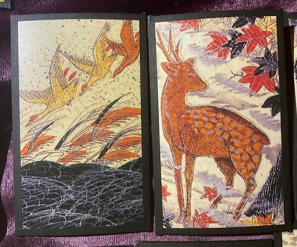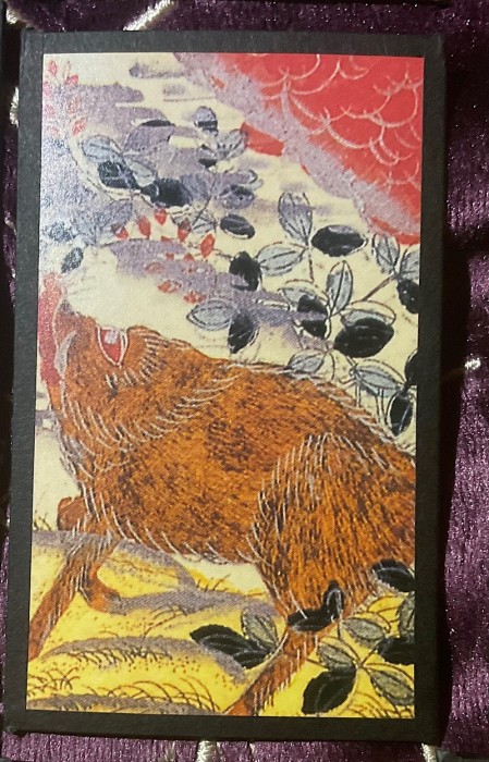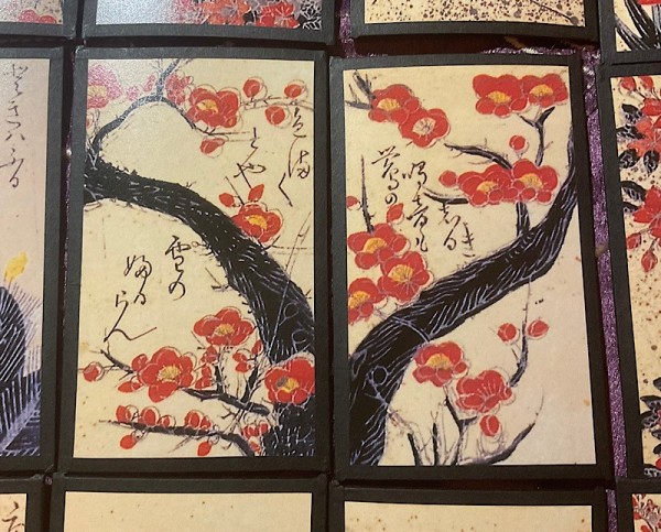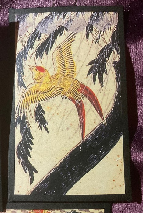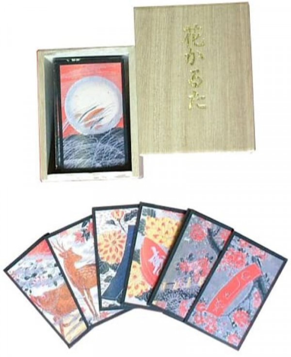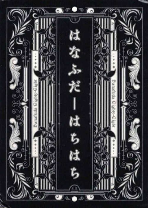 A replica of an original deck dating back to the Meiji era (1864-1912), that one century earlier had been commissioned to the same manufacturer by Itô Hirofumi (1841-1909), the first Japanese prime minister. He was a lover of figurative art of his own country, and had a particular interest for the typical flower card illustrations. During the 19th century, despite some graphic details were still partly subject to changes, the design of the local cards had gradually reached a certain stability, and its basic elements had become a standard: a crane on the first card of Pine, a nightingale on the same card of Plum, the curtain on Cherry, and so on, including the ones with red and blue ribbons. The edition that Hirofumi had made by Ôishi could be described today as "luxury". The maker kept one copy for himself, and from this specimen, in 1991, a faithful replica was obtained, also called Sôridaijin no Hana-karuta ("prime minister's flower cards"), in honour of the important client.