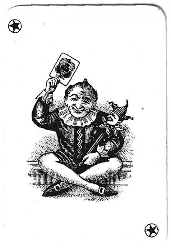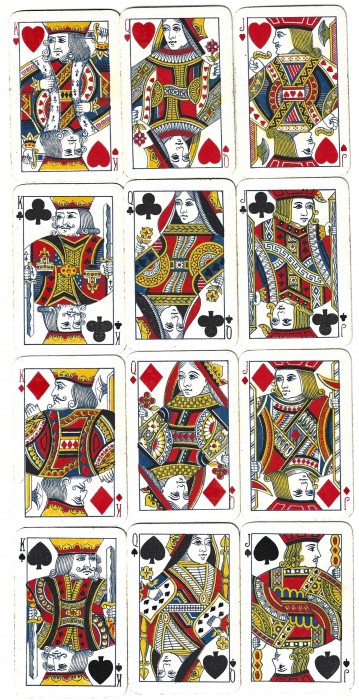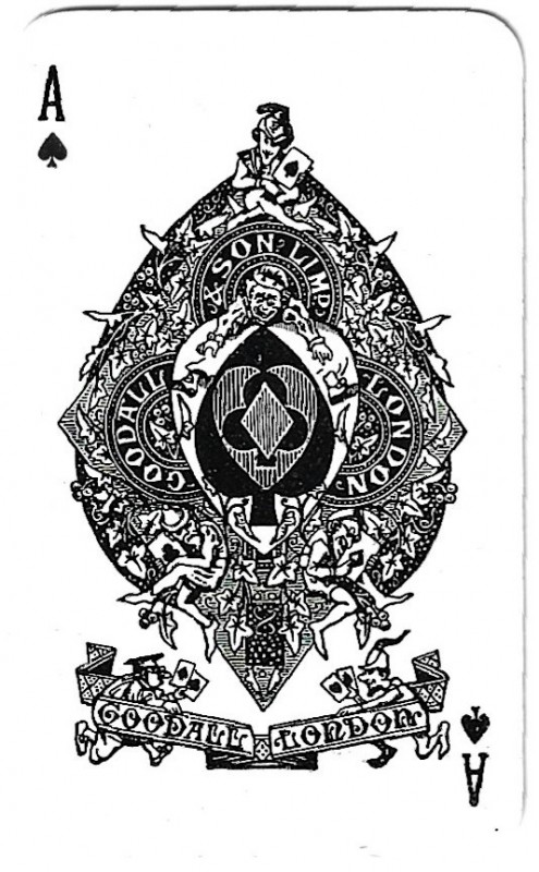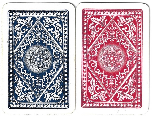 Two decks of cards are stored on their sides with a divider to separate them and a lid which slides completely over the base. The base extends slightly beyond the lid when assembled. Goodall produced this basic model in a wide variety of colours, materials and fonts. Each deck have an identical back design: One in Red, one in Blue. Each deck contains one joker and one blank card.