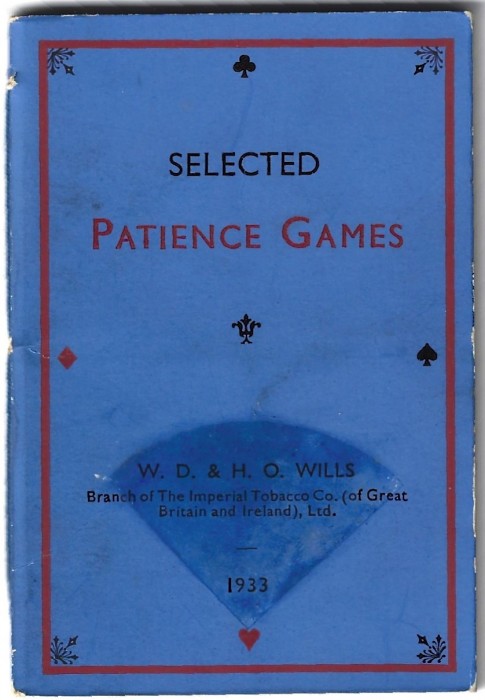 Two miniature packs could be exchanged for two packs of “De Luxe” patience cards together with a specially prepared mini-book containing details of a wide variety of patience games. As with all the booklets prepared for this promotion, it is dated 1933. (Information from the WOPC site)
