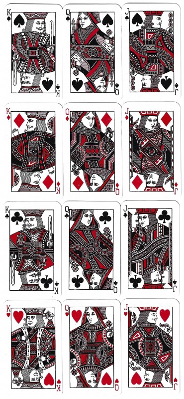 2 Decks of 52 cards each, plus 1 joker and blank card in each. Set contains a booklet of selected patience games.