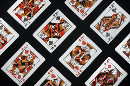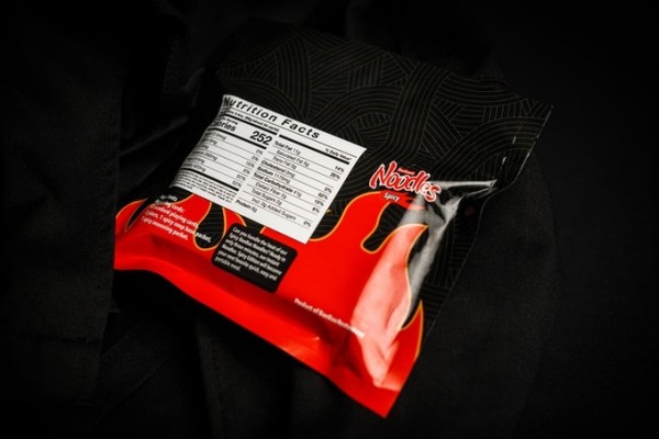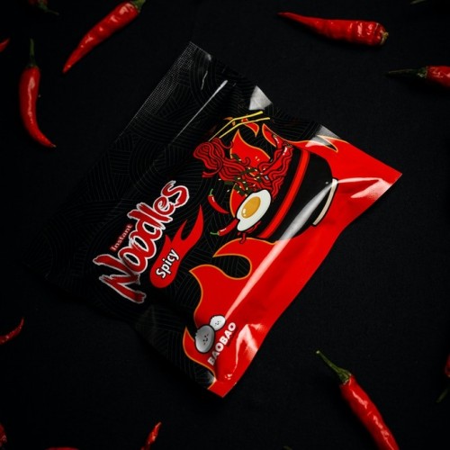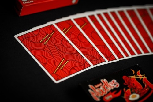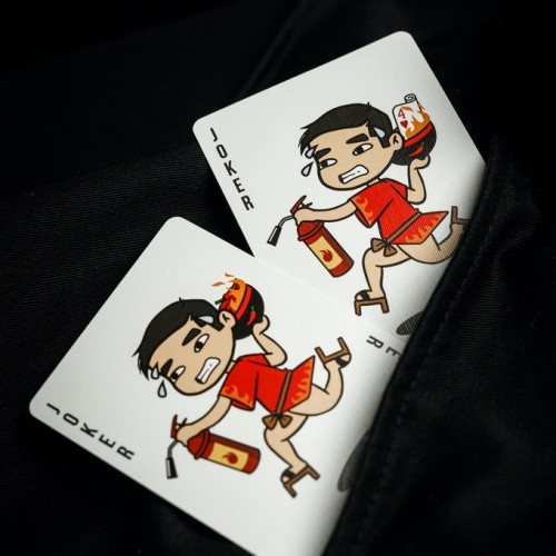 A fun and classy take on your traditional instant noodles, featuring a unique packaging and a sleek card design. Now, comes in spicy flavour! The deck is refurbished from the previous edition to be the spicy version. The artworks for the pips remain the same shape - the Ace of Spades is turned to red. The courts are now representing the royals enjoying their spicy meals, as well as counter measure to the spiciness (drinking water and milk) - some of the details are ommited to create a minimalistic design. The two extra cards are showing the instant noodles seasonings and soup base in spicy flavor. The Jokers are identical showing a chef holding a bowl of spicy noodles and a fire extinguisher - presenting a card reveal. The back design is adopted from the previous version, only that it is bordered, two-way artwork, and red noodles with yellow chopsticks. The packaging is a resealable bag containing the deck with two stickers of the extra cards from the deck - for this edition, the bag is landscape oriented instead of portrait orientation from the previous edition.