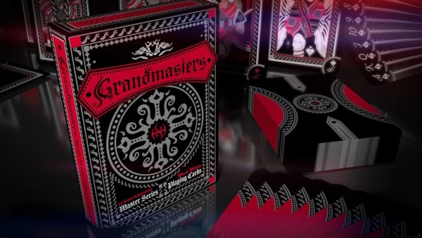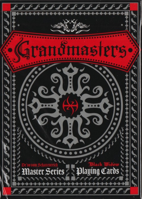 MASTER SERIES - "Grandmasters by De'vo - Black Widow Spider Edition" is an AMAZING Black version of De'vo's famous Grandmasters deck which introduced "Princess Court Cards" that adds bonus features. AVAILABLE ONLY FOR 14 DAYS ONLY! This very special black version features all black face cards, a drop dead gorgeous back design which creates stunning fans, custom pips, and custom court cards.