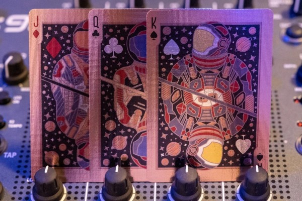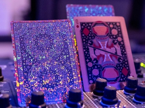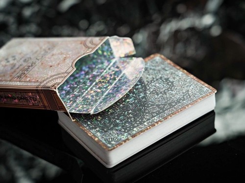 We use an ultra-thin mylar, or full foil, laminated on both sides. The card backs are a new holographic full foil pattern, and the faces are standard silver. Like Pokemon cards, both feature overprinting at different opacities to block out the shiny effects of the full foil. The only difference between these and trading cards is our decks spring, fan, and handle like a normal deck of playing cards! A designers dream, and totally out of this world technology for future playing card decks.