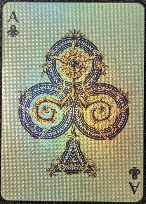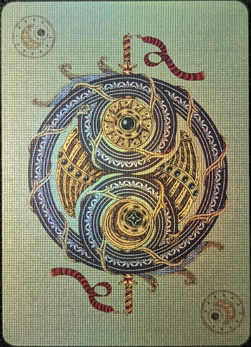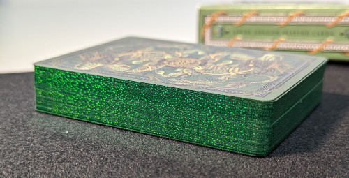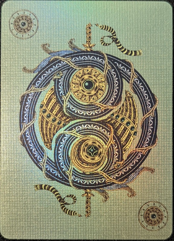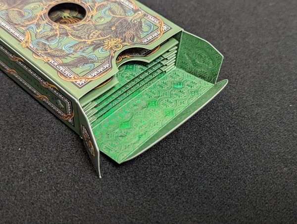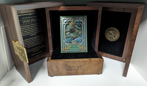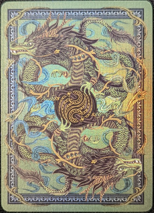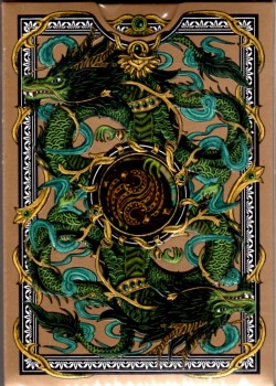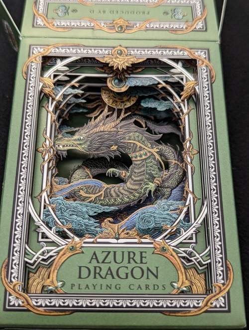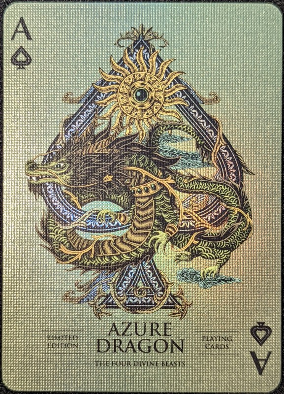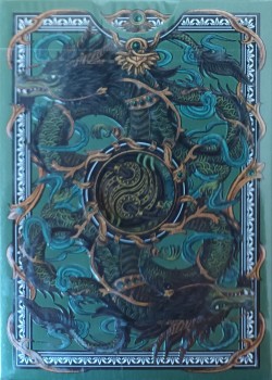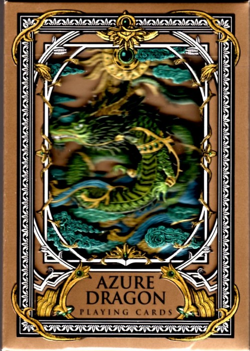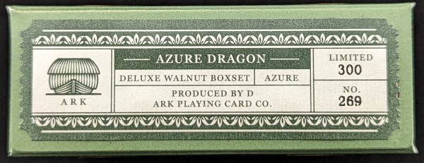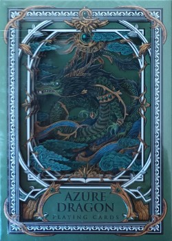 ARK Playing Cards drew inspiration from one of the mythical guardians of the East, the Azure Dragon. Taking shape in a uniquely designed tuck box, which magically doubles as storage and display of art - Walnut Collector's Box Set includes 1 deck and a metal coin // Oriental Azure Dragon Theme // Paper carving 3D tuck box // Walnut Display Case // Luxury Gilded Edges