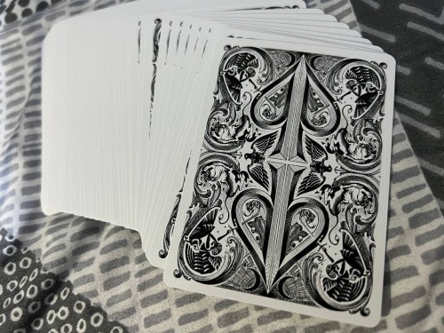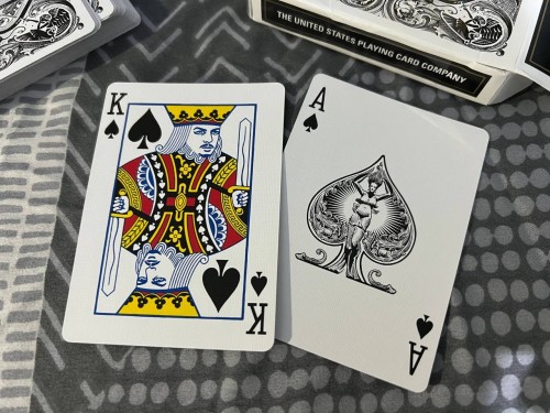 This Split Spades deck is made in the establishment of a magic class by David Blaine with Studio. The first 10,000 students who enrolled to the class will receive a complimentary gift of this exclusive deck: one signed for collection and one unsigned for use. Colors are randomized and you can't choose what color you will get. The identical Jokers feature an illustration of a bald guy spewing ravens with few of the birds perched on top of the head and trees sprouted from the ears. The two extra cards featured an illustration of Asi Wind's magic book and a step-by-step guide to do Charlier Cut. This Split Spades is marked for order number of a Mnemonica Stack [but the deck comes in New Deck Order].