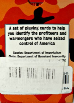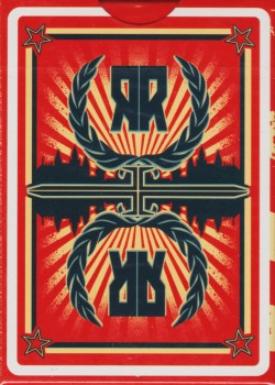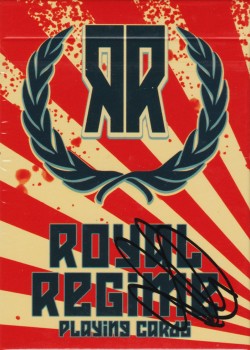 The Royal Regime decks include 55 custom cards featuring hand-drawn front-facing standard court cards with familiar elements and back design that look like a real propaganda poster.
