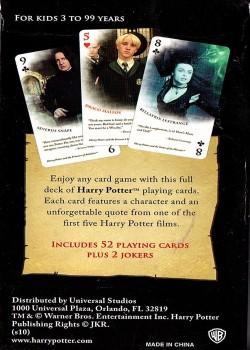 Deal up a game with Harry, Ron, Hermione and all their friends and foes. These are not your typical playing cards! Each card in this Harry Potter deck has a full color image of your favorite characters from the Harry Potter books. Thirteen different characters appear, one for every number grouping, to add some magical fun to your card games.
