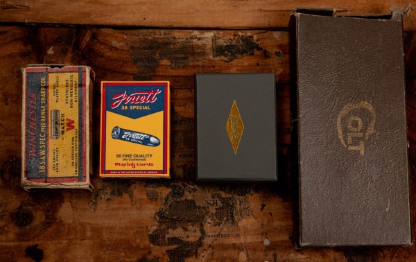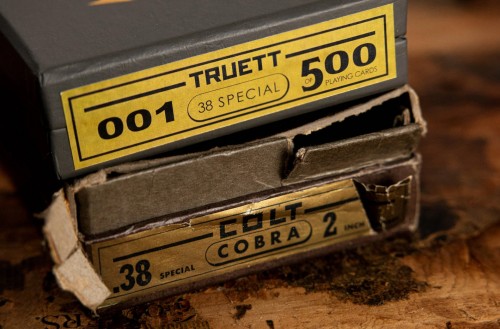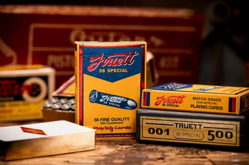 The Truett 38 Special features rich, bold colors, resembling the original ammo boxes accompanying the gun handed down to Jackson by his grandfather George Truett. The Gilded Truett features red foil on the tuck case alongside a brilliant gold gilding. The deck comes nestled in a gray leatherette box with "Truett" inlaid in beautiful gold foiling. The decks are numbered out of 500.