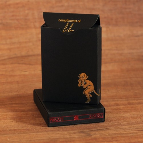 The Private Reserve decks are the true, original vision for the Whispering Imps® playing cards created by Chris Chelko, hand illustrated by world renowned artist Mark Stutzman and printed to exact specifications by The Expert Playing Card Company. Two versions of the Private Reserves were printed for Whispering Imps Productions in extremely limited quantities. The classic back design in Imp Red, housed in a thick matte black paper tuck and stamped with the trademark Whispering Imp in Bright Red foil, and the classic back design in Black, housed in a thick matte black paper tuck and stamped with the trademark Whispering Imp in Gold foil. The Private Reserve decks were printed in response to the Original & Special Edition decks being completely sold out and with the intent to remain a true, private reserve. Never to be sold and for the private use of those who have acquired them. Features: Perfect Border Registration Thin Borders Newly Discovered & Remastered Pre-1900\'s Court Cards Ace of Spades marked with \"Private Reserve\"" Jokers marked with \""Private Reserve\"" Tuck Box: Premium Thick Black Matte Finish: Premium Embossed Paper Stock with Expert Finish Quantity: 1000 (Red Back
