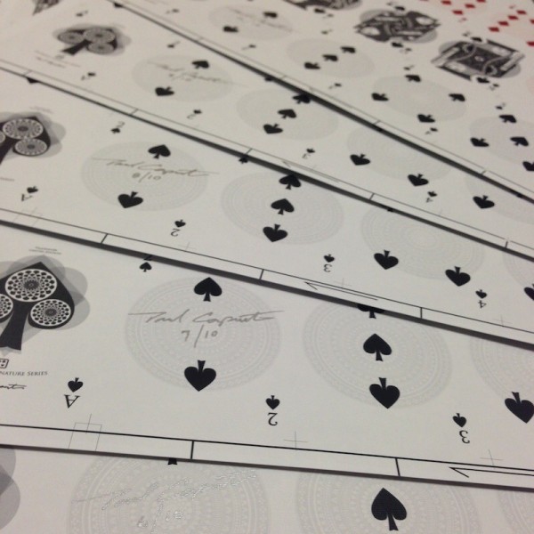 The Zenith uncut sheet is the rarest Encarded item avaliable for public sale. Only 15 of them were made and just 10 were available for sale in the Encarded store. Each Zenith uncut sheet was signed and numbered (X/10) in silver ink by Paul Carpenter. The overall affect of the back design when seen in uncut form is almost hypnotic and these sheets are a very special collector item. The sheet is 54 cards, not the 56 typically seen from USPCC decks, and is therefore a slightly different dimension. Actual dimensions are 24 1/4\\\" wide x 22 5/8\\\"" tall."