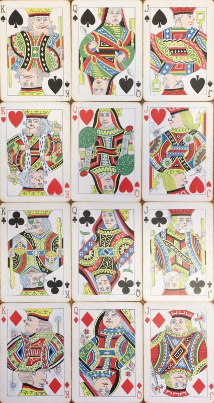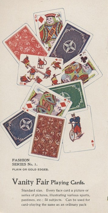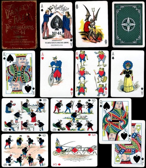 Vanity Fair Transformation Playing Cards No.41, published by the United States Playing Card Company, 1895, 53 cards in box. All the number cards have been imaginatively transformed and the court cards have been modified. This is USPCC's first true transformation deck and like the 1879 transformation deck 'Tiffany Harlequin', which likely prompted USPCC to finally make a true transformation deck (slightly earlier Hustling Joe wasn't a true transformation), it also has comical court figures. It came in a total of 4 variations with gold gilded edges (brown or red backed fanciful demon design) or non-gilded (blue or green asian faces with hats in a snowflake design center with comical masks in the corners). http://www.wopc.co.uk/usa/uspcc/vanity-fair