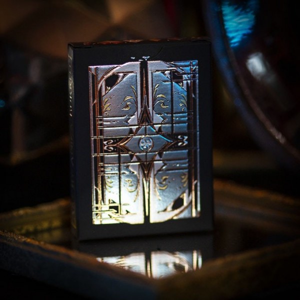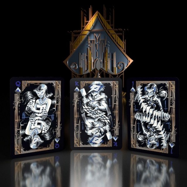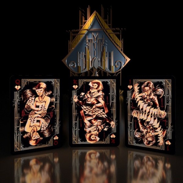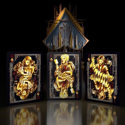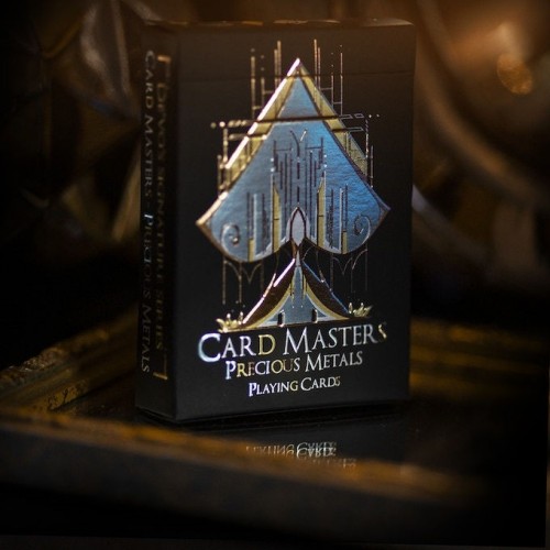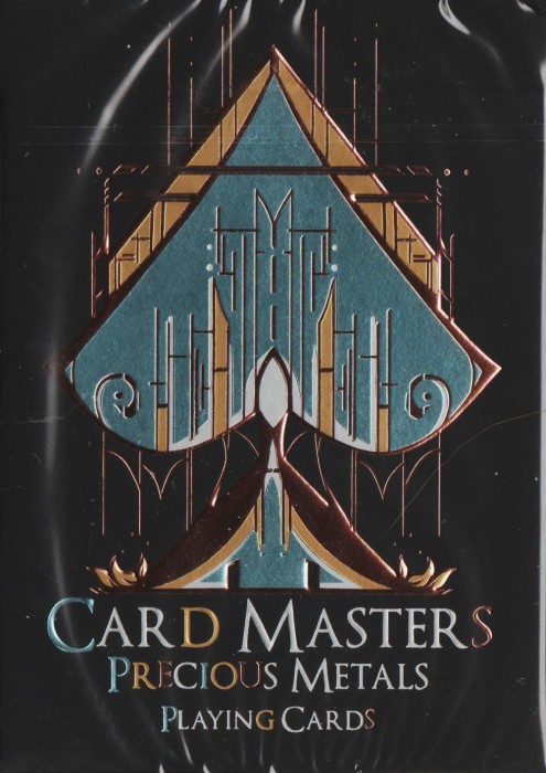 "De'vo's Signature Series Card Masters" Precious Metals is the embodiment of unique and beautiful in playing card design! This amazing new deck has custom everything- custom pips, court cards and jokers all done in 4 different precious metal coloring patterns - Platinum, Tungsten, Yellow Gold and Rose Gold. The AMAZING artwork by Anika Burrell is breathtaking! Each suit has its own unique mask and coloring broken up into the 4 different precious metals.