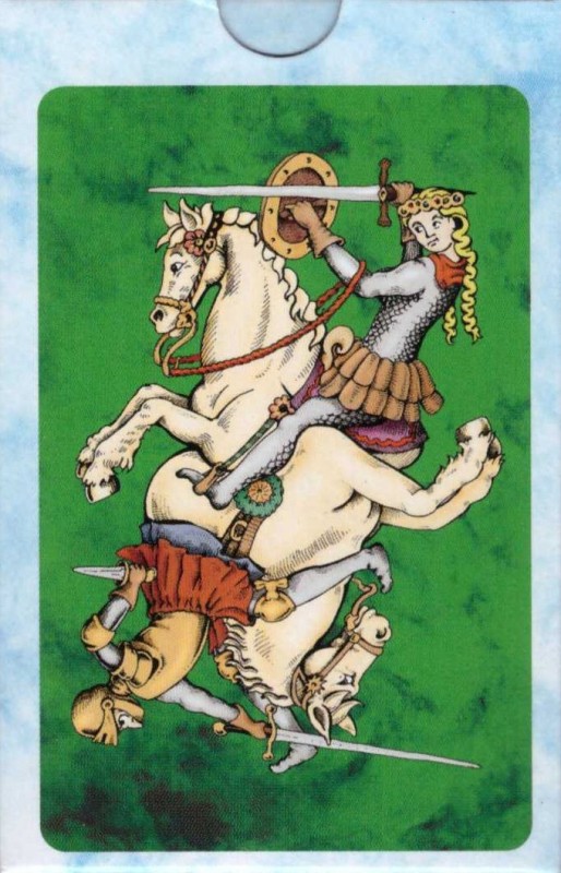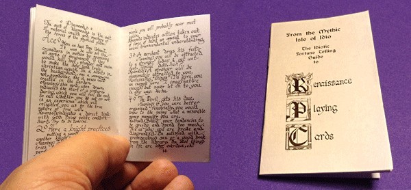 Blue tuck/back version of Renaissance Playing Cards by Maxim Hurwicz. The bridge sized deck 55 custom designed artwork, unique to each card, including 2 jokers and ad card. Also, includes a 24 page hand-lettered booklet on fortune telling. Printed in Mumbai, India (via tmcards.com). https://www.kickstarter.com/projects/424368844/renaissance-playing-cards-each-unique-card-hand-dr