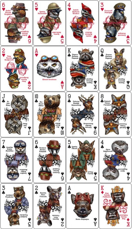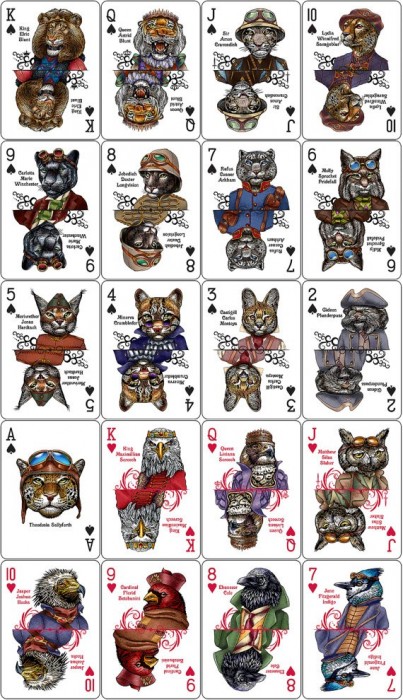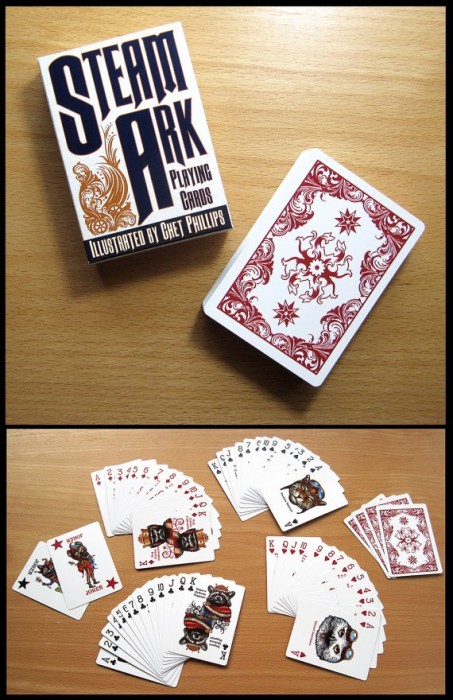 Steam Ark Playing Card Set- Illustrations and text by Chet Phillips Plastic coated, casino quality poker deck with custom printed tuck box. 52 individual portrait cards with 2 jokers and 4 Clan Suit cards. The deck is divided into 4 Victorian Steampunk animal clans: Predator (Big Cats/Spades), Simian (Monkeys and Apes/Diamonds), Aerie (Birds/Hearts) and Woodland (various woodland animals/Clubs). Custom card back in red.
