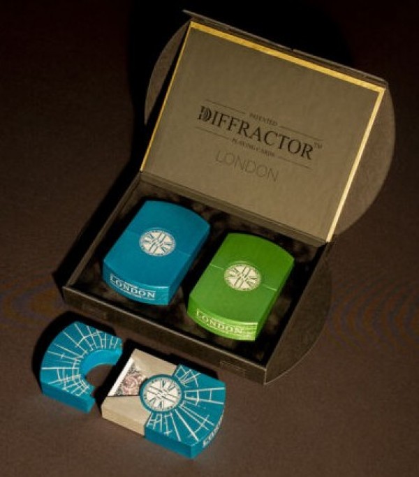 ICE BLUE METAL CASE AND ICE BLUE DECK VXD Gaming brings you the London Diffractor. Designed by VXD Gaming and Lance T Miller and produced by Vrijdag Premium Printing, the London Diffractor decks use the patented printing technology developed by VXD Gaming (US. Patent. No. 8,777,225), which combines a standard layer of ink printing, as found on normal playing cards, with an additional hot-stamped layer of transparent holographics, of the type typically only found on passports and other ID documents. This combination produces an entirely unique look within the playing cards industry and presents new possibilities for design expression and sets a new bar for luxuriousness. The result is a mesmerizing combination of holographics and ink, lighting up at different angles and in different lighting conditions and producing a combined artwork which tells a story of the heritage of London. Our tip: For best effect, we recommend viewing under a single bright light source such as a halogen spotlight, with ambient lighting around (such as daylight) cut to a minimum. Casino table lighting conditions are ideal, for instance.