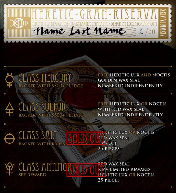 Heretic Playing Cards by Lorenzo Gaggiotti (Stockholm17) is based on alchemy and the hermetic world. Salt (for the Jacks), Sulfur (for the Queens) and Mercury (for the Kings) are the three basic ingredients of the alchemist. This PCDB entry is for the Lux version of the Gran Riserva edition, Mercury class (just 6 serialized decks made with this class seal). Each deck in each class for the Gran Riserva editions have a custom printed seal for each class, plus a wax seal and signed by the artist. Other classes available in the Gran Riserva edition were classes for Sulfur, Salt and Antimony (for both Lux and Noctis), each with different quantities made. These are the tuck and cards as the basic versions of Lux and Noctis, but with the added seals and signed. In addition, there was also the basic versions of both the Lux and Noctis decks, plus uncuts of each. https://www.kickstarter.com/projects/requiemcards/heretic-playing-cards
