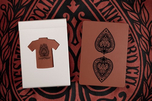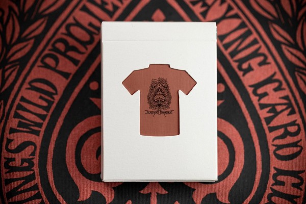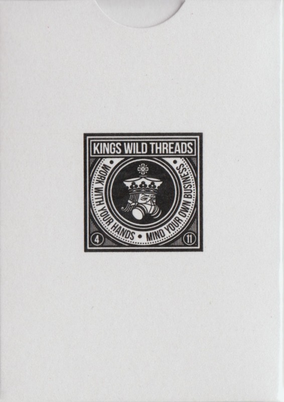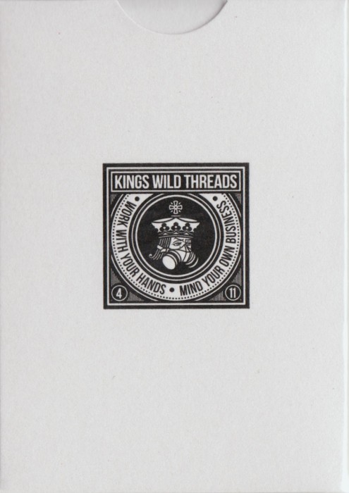 "The Newest Kings Wild Threads Deck features the Ace of Spades from the Crow Brand deck. These limited print decks feature a matching two-way pattern on the back design and an extra card with the Ace of Spade which can be viewed through the custom shirt shaped die cut hole on the tuck case. Designer Jackson Robinson used his own standard court and pip designs on this simple yet unique deck of playing cards."