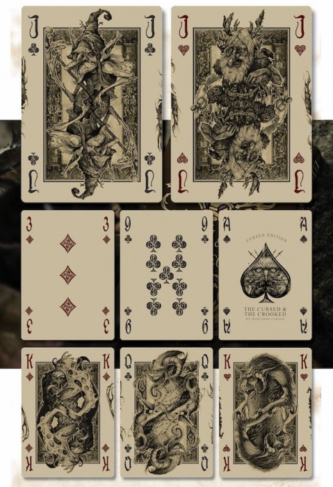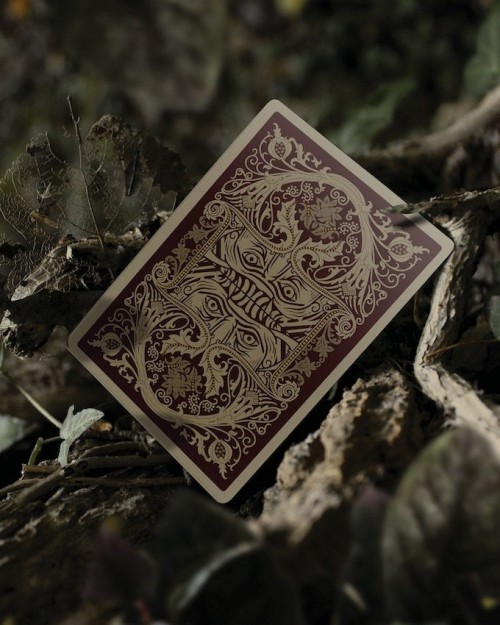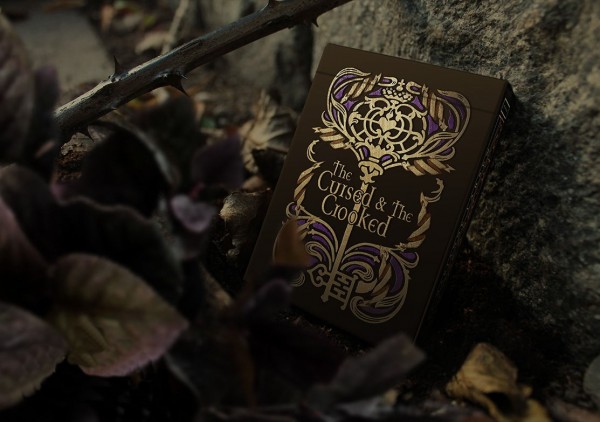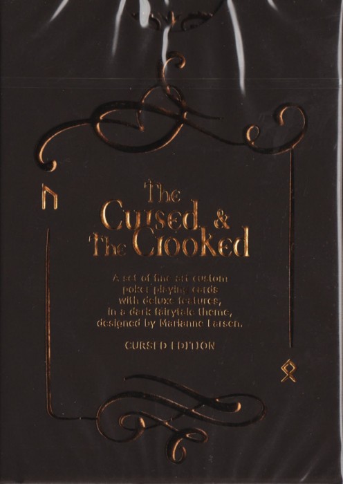 The tuck seals of The Cursed & The Crooked are true standouts, designed in a horisontal sticker format, each featuring the unique number for every deck made. To add to the originality, these seals are going to be positioned at the tuck bottoms. The Cursed edition card backs have a two-way design, richly detailed with folklorish floral ornamentation and ever staring eyes from the depths of the forest.