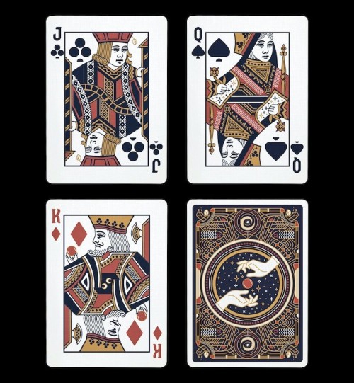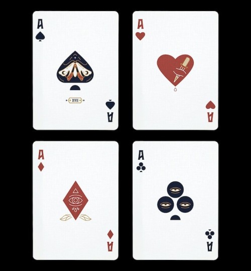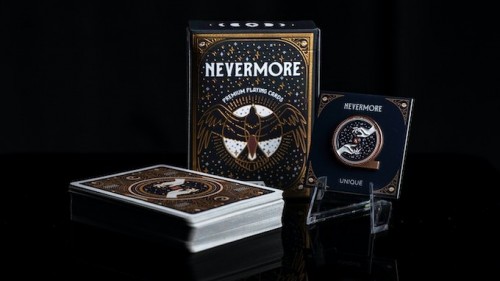 Funded as a Kickstarter project on September 11, 2022, with €13 857 (Goal: €5 000) pledged from 236 backers. This is the first deck created by Unique Playing Cards. If you pledged for the "Unique Collector's Pack" you would receive the Nevermore emblem and the Original emblem, if you collect six emblems you will get access to the "Vault of miraculous tools and crafts" and free rewards. What these rewards are is unknown at the time when this Kickstarter was released.