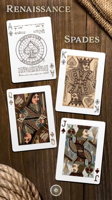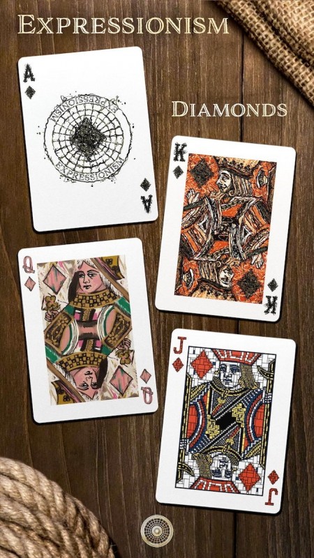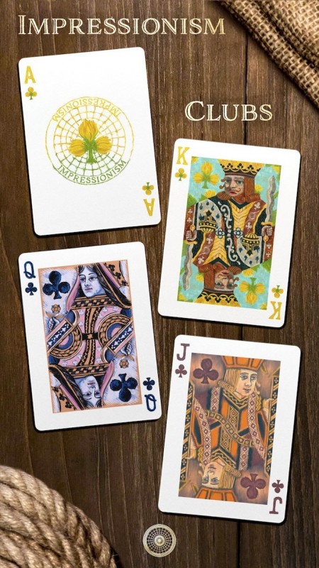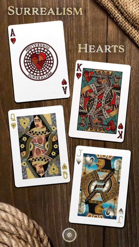 Each suit represents an artistic movement. Rather than stick with the classic black and red card design, every card features completely original artwork, with unique design elements on the number cards and hand illustrated paintings as the Jacks, Queens & Kings. With every number card alternating between the three main styles illustrated in the face cards, the deck becomes a visual feast for the eyes.