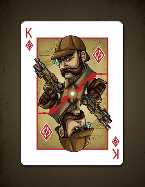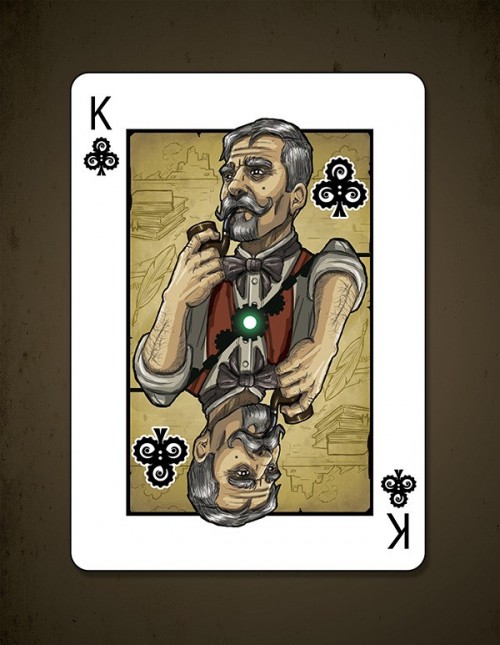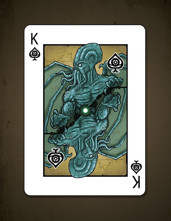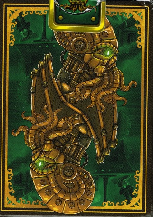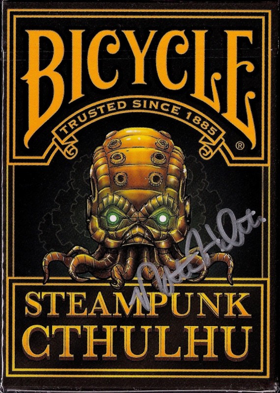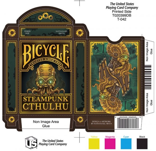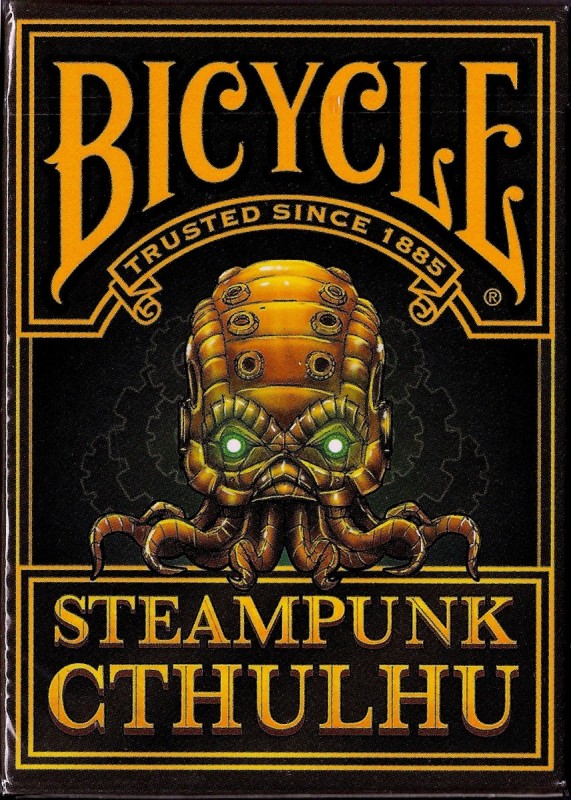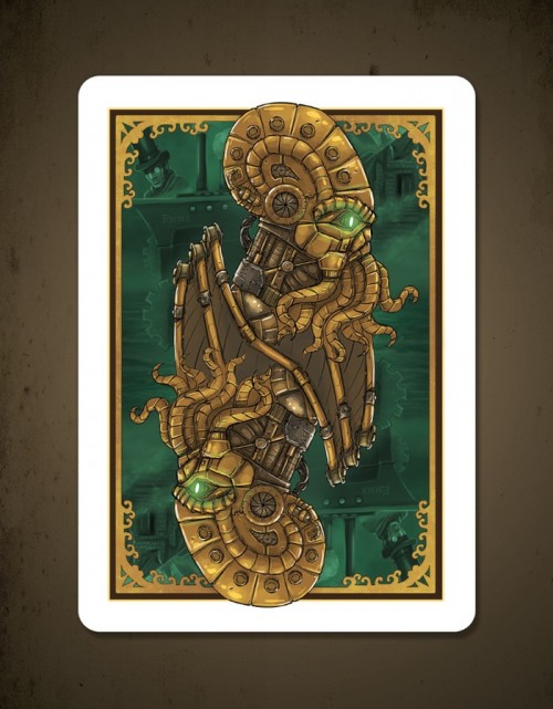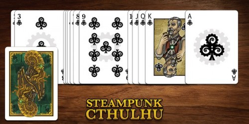 Steampunk and Cthulhu have joined forces to grace the surface of a custom deck of poker sized playing cards. Designed by a world famous (ok, maybe not exactly) Steampunk artist and printed by USPCC. This unique combination has led to some kickin\\\' art. Featured on the back of each card in the deck is the mighty Cthulhu himself at the center, with scenes from the story in the background, all with a Steampunk twist. Court cards will show characters from the story, and possibly the faces of a few generous backers. Here\\\'s what you\\\'ll get in the deck: - Artwork based on a Steampunk rendition of The Call of Cthulhu - Beautifully designed and printed card backs - Unique court cards with scenes and characters from the story - A custom Steampunk Cthulhu tuck box, perfect for tucking - Custom seal - Magic finish