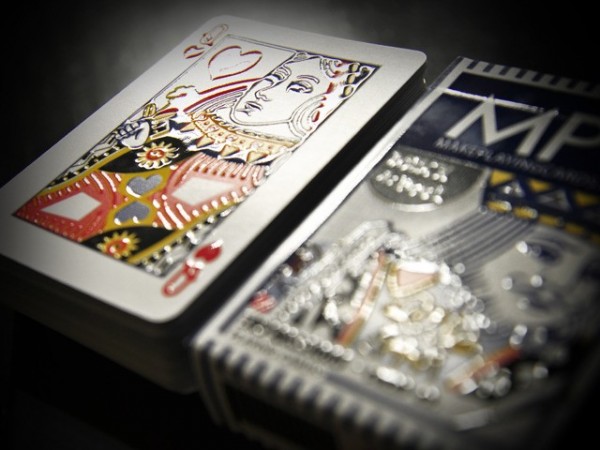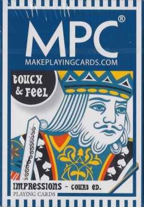 Cards from MPC (MakePlayingCards.com) that use raised/textured ink on the cards. This version is the full color and large sized courts edition. https://www.kickstarter.com/projects/makeplayingcards/impressions-playing-cards
