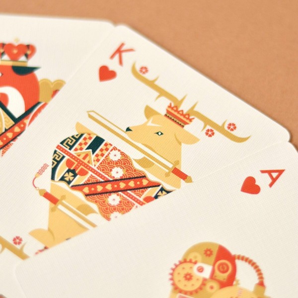 But the attention to detail doesn’t stop there. The playing card box is just as impressive, featuring a stunning gold foil design that showcases all the suit symbols as mechanical devices on the back – a nod to our “Remake You + Me” series of prints.
