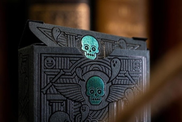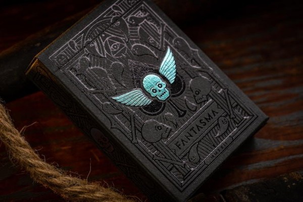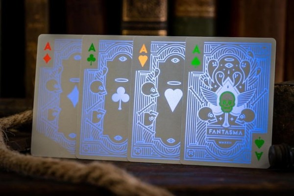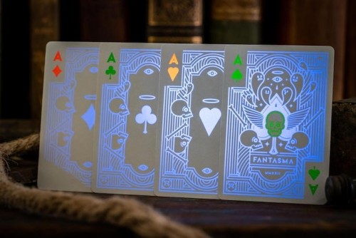 Fantasma is a series of poker playing cards designed by Thirdway Industries, inspired by Ghosts. This project is experimental, and marks the first deck by Thirdway Industries to be printed almost entirely with invisible ink. The court cards are fully custom, intricate and invisible under normal light. Only a blacklight reveals the design! The indexes are printed with Neon Ink, which is visible in normal light but fluoresces under blacklight, becoming more vibrant.