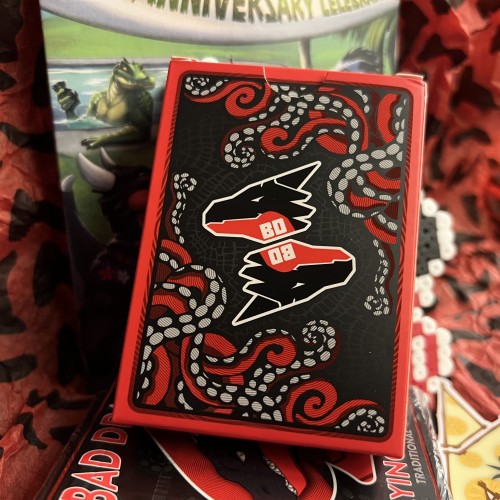 This is a merchandise from a company called Bad Dragon. The design for this deck is made for casual gameplay. The Aces, Courts, and Jokers are featuring the company's characters: Chance the Horse, Rex the German Shepherd Dog, Janine the Dragoness, and Duke the Dragon (who is also the mascot of the company). The card back design is a two-way artwork of the company's logo with the border of Ika tentacles (which is also present on the courts). Artwork done by artist AcidaPluvia. This deck has cards made with premium PVC, printed in PRC. The artwork between two versions are the same - only differs in material.