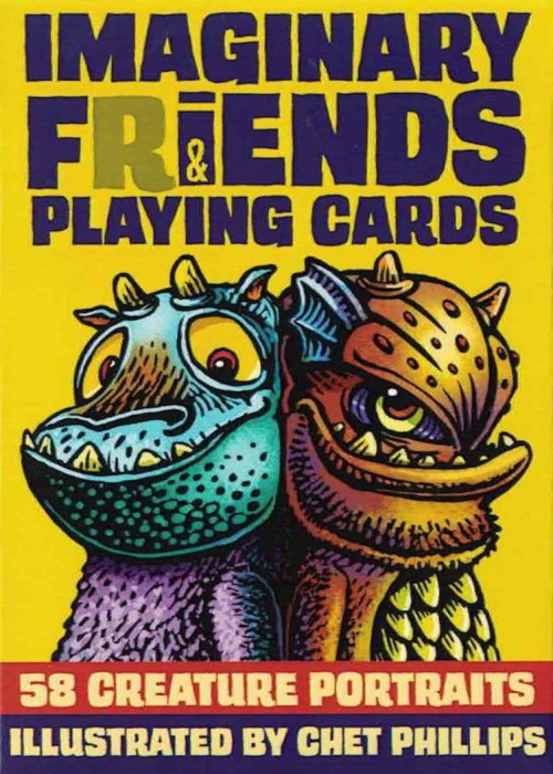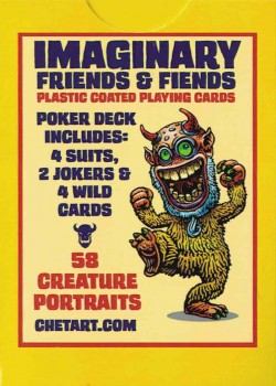 A plastic coated poker sized deck of playing cards showcasing 58 original character portraits named and illustrated by Chet Phillips. When you were a child did you have an imaginary friend or an imaginary fiend? Deck includes 2 Jokers and 4 Wild Cards.
