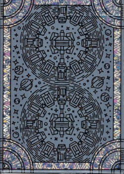 As for the playing cards, we use an ultra-thin mylar, or full foil, laminated to thin paper on both sides. The card backs are a holographic full foil pattern, giving these decks an otherworldly shimmer, and the faces are standard silver mylar. Like rare Pokemon cards, the faces and backs feature overprinting at varying opacities to block out the shiny effects of the full foil. The only difference between these and trading cards is our decks spring, fan, and handle like a normal deck of playing cards! A designer's dream, and totally out-of-this-world technology for future playing card decks like the Fontaine Characters or Haas Brothers x L'Objet colloboration.