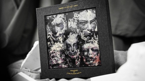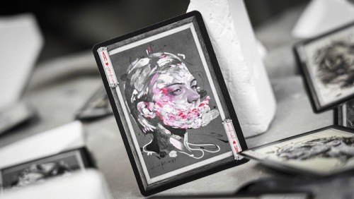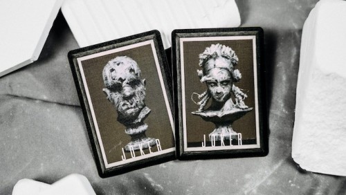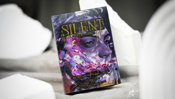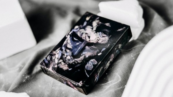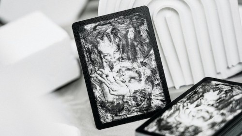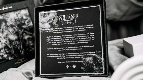 Silent Playing Cards is a series of decks showcasing the amazing works of Korean artist Lee Killust. His illustrations are exhibited in a form of 52 playing cards. The artworks of Lee.K presenting portrait paintings of people without their mouths, symbolizing the silenced words of expressions. Mirage Edition features tuck box made of lenticular lens grating art, in which the artwork changes as you tilted the box. It is a set of 2 decks in a collector's box, also have grating art. The set is made with the technical support from ARK Playing Cards. This is Deck 2 of the Set: the black version of Silent Gray. The faces are modified with black background and wooden frames add-on - designed as if a card represents an art catalog of Lee.K art exhibition.