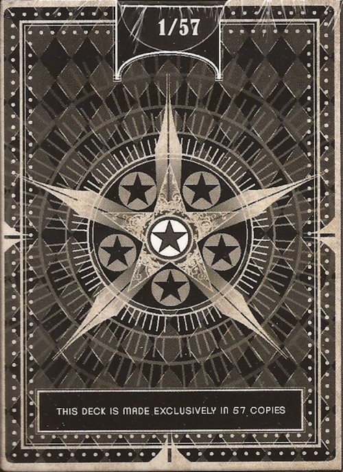 AMBASSADOR is an extremely limited, numbered, and kickstarter exclusive, noble deck of high contrast black and white design. An opulent orange ink is used for the hearts and diamonds suits and represent the one and only actual color in this deck. Sharp and highly detailed crowns present the court cards with the suit diagrams implemented in the design. This deck is only made in 120 copies and has the owners name on the front of the tuck box.