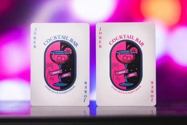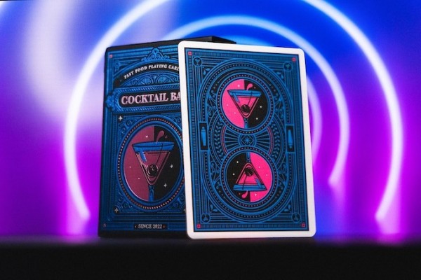 Part of the Pizza & Cocktail Playing Cards by Fast Food Playing Cards. Our COCKTAIL BAR deck is where sophistication and mixology expertise converge. Immerse yourself in the tantalizing ambiance of a stylish bar, where every sip is a journey to exquisite flavors and refined craftsmanship. Let us transport you to a realm of libation-inspired indulgence, where each shuffle and deal becomes a celebration of cocktail culture and the art of savoring life's finer moments. - The COCKTAIL BAR deck is an electrifying spectacle that will transport you to the lively ambiance of a neon-lit cocktail bar. Bathed in hues of blue, dynamic lines traverse the backdrop, evoking a sense of motion and energy. The addition of sizzling hot pink accents infuses the design with a playful and captivating charm. Nestled at each end of this symmetrical composition, two elegantly crafted martini glasses stand as symbols of sophistication and celebration.