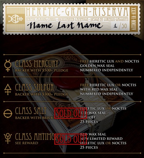 Heretic Playing Cards by Lorenzo Gaggiotti (Stockholm17) is based on alchemy and the hermetic world. Salt (for the Jacks), Sulfur (for the Queens) and Mercury (for the Kings) are the three basic ingredients of the alchemist. This PCDB entry is for the Noctis version of the Gran Riserva edition, Sulfur class (just X serialized decks made with this class seal). Each deck in each class for the Gran Riserva editions have a custom printed seal for each class, plus a wax seal and signed by the artist. Other classes available in the Gran Riserva edition were classes for Sulfur, Salt and Antimony (for both Lux and Noctis), each with different quantities made. These are the tuck and cards as the basic versions of Lux and Noctis, but with the added seals and signed. In addition, there was also the basic versions of both the Lux and Noctis decks, plus uncuts of each. https://www.kickstarter.com/projects/requiemcards/heretic-playing-cards