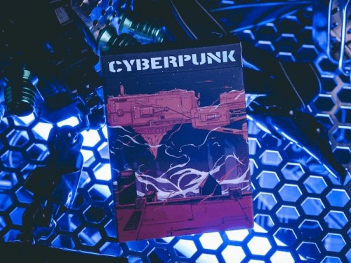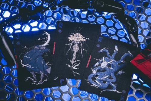 Cyberpunk Mythos is a collection of six playing cards inspired and celebrates East Asian mythologies and the cyberpunk subculture. The series featuring the exclusive drawings of 30 mythical beings and environments as described in "Shan Hai Jing" (a compilation of Chinese mythic geography and creatures). The beasts are imagines as cyborgs that escaped their cages from labs, prowling neon-drenched streets or watching pensively atop unreachable skyscrapers. They are illustrated for the back design, courts, and/or the diptych jokers. All of the Aces featured customized enlarged items shaped as the suits, with the Numbers using miniaturized version of them. All of the decks are printed by KingStar Playing Cards Co. (KSPCC) on 280 gsm Japanese black core paper. Two of the decks are standalones, while the remaining four decks are only available in a collector's box set - which includes an enamel pin, a sticker pad, three postcards, and three bookmarks.