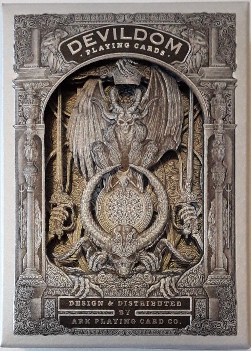The Devildom Dark Evil collector's edition box, includes a Dark Devildom and a Silver Devildom deck of playing cards. This is a luxurious and exquisite high-end playing card gift box set specifically designed for a demon-themed poker deck. The gift box features black and dark silver as the main color scheme, creating a mysterious and noble texture. The front showcases a multi-layer embossed artwork composed of four layers, each utilizing full-panel embossing and hot foil stamping techniques, resulting in a visually stunning and three-dimensional image.