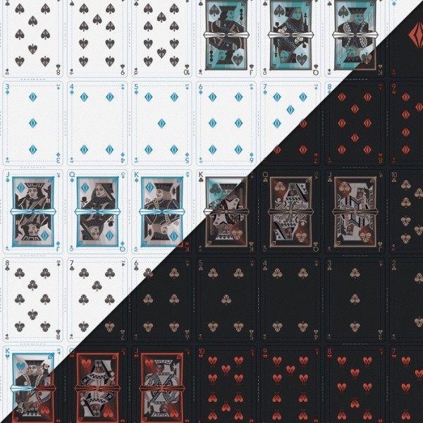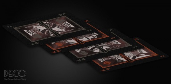 Card Details: - Deco will be a limited 5,000 deck production by the US Playing Card Company. They will be sold in a pair, 2,500 sets total. It will not be reprinted or released again. Most major deck releases are printed in the tens of thousands, so Deco will be a guaranteed rarity from the start. - The cards will be on the highest-end Bee Casino stock with the excellent Magic finish. They will handle at the supreme top-end of the playing card scale. When you bring these out at your next poker game all your friends will notice how great they shuffle. - Deco Silver will be the light deck, with metallic silver, rich blue and white tones. Deco Bronze will be the dark deck, with warm near-black colors, metallic red and metallic bronze. - Deco has unique 90-degree four corner pips, carefully designed to assist with identifying cards when playing card games as well as adding visual detail during card flourishing or magic. - Deco will feature many elegant, hand-crafted details. Metallic inks add shimmer and depth and the deck is housed in a beautiful foil and embossed tuck box.