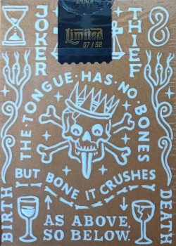 Made with premium paper stock, and a finish that allows the cards to effortlessly glide. All housed in a beautiful tuck box with heavy embossing on the design elements. Sealed with our foil, Joker and the Thief Manufacturer Seal.