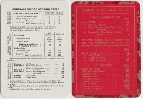 The Deck contains 52 cards + 2 Jokers + 1 double sided printed scoring table for Contract Bridge and Canasta.