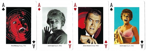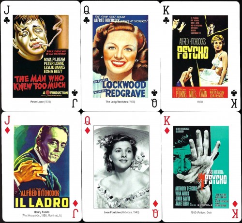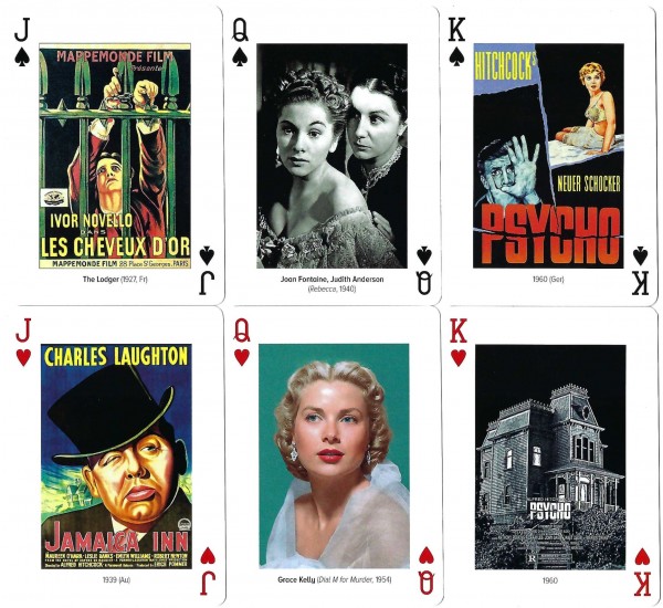 The deck has some structure: Aces – close ups of his leading lights, wracked with fear, Twos – Suitably couples from four of his classic films, Threes – Film posters, Fours – monochrome photos of Hitch and leading men, Fives through to Jacks – A fabulous selection of posters, including rarely seen European ones, Queens - naturally his leading ladies, Kings – Are all related to possibly his most infamous film, Psycho. The jokers feature Tippi Hedren and Hitch from The Birds.