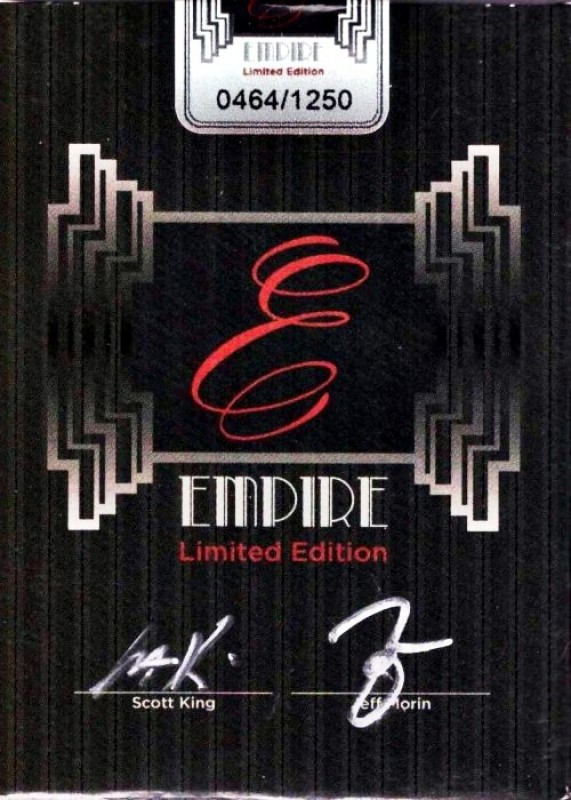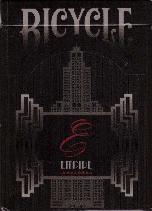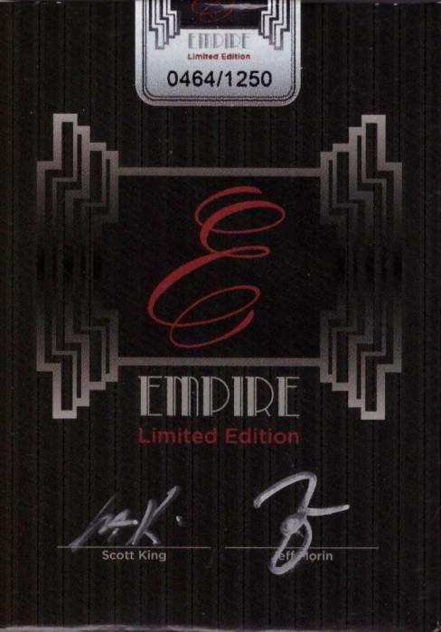 Funded as a Kickstarter project on July 22, 2014 with $53,355 pledged from 756 backers, this was ultimately a set of 6 decks, some with custom cards and some tuck swaps, plus uncut sheets and varied non-deck add ons. Using the 1920s-30s mobster era as inspiration, this USPCC deck series consists of the Gold and Silver decks, later followed by limited edition Cotton Club and Stork Club decks (1,500 each) which were tuck swaps and finally the limited editions of Empire and Kingpin (1,250 each) which were fully different decks (face cards, backs and tuck). While the decks were designed, submitted and copyright 2014 they were not printed or delivered until early 2015. This PCDB Entry is for the 1,250 limited edition Bicycle branded Empire deck. They featured not only a different tuck, but custom courts, design and back as well. Like the other limited decks in this series, they also used serialized seals on the decks.