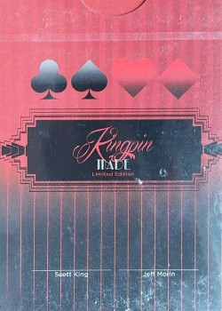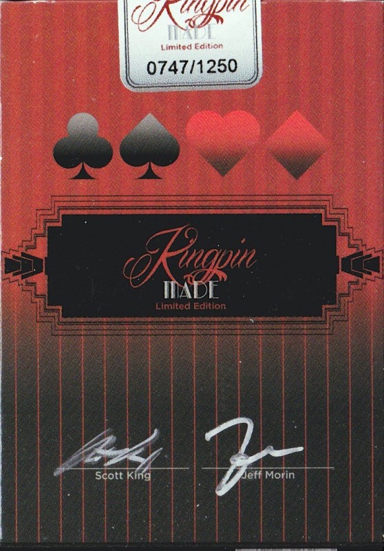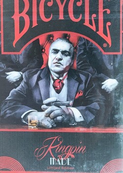 Funded as a Kickstarter project on July 22, 2014 with $53,355 pledged from 756 backers, this was ultimately a set of 6 decks, some with custom cards and some tuck swaps, plus uncut sheets and varied non-deck add ons. Using the 1920s-30s mobster era as inspiration, this USPCC deck series consists of the Gold and Silver decks, later followed by limited edition Cotton Club and Stork Club decks (1,500 each) which were tuck swaps and finally the limited editions of Empire and Kingpin (1,250 each) which were fully different decks (face cards, backs and tuck). While the decks were designed, submitted and copyright 2014 they were not printed or delivered until early 2015. This PCDB Entry is for the 1,250 limited edition Bicycle branded Kingpin deck. They featured not only a different tuck, but custom courts, design and back as well. Like the other limited decks in this series, they also used serialized seals on the decks. https://www.kickstarter.com/projects/crookedkings/get-made-mob-themed-uspcc-bicycle-playing-card-dec/